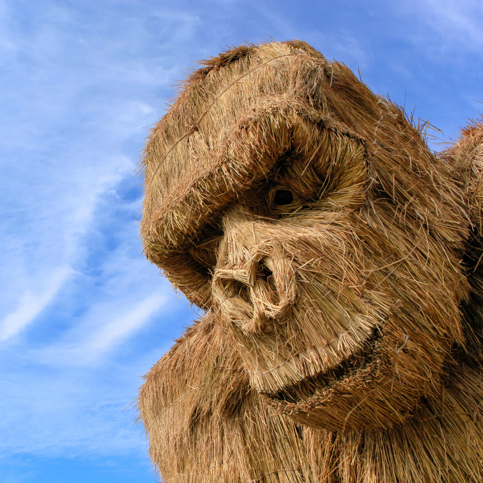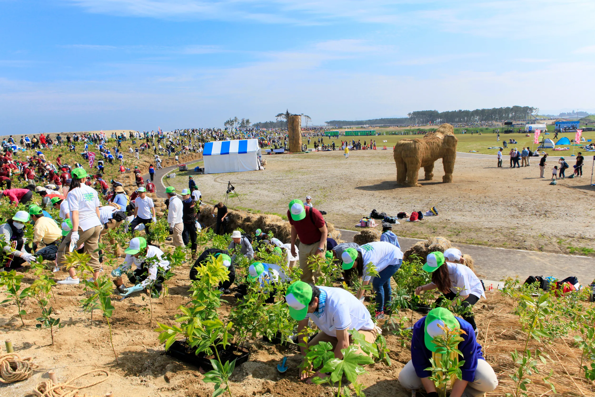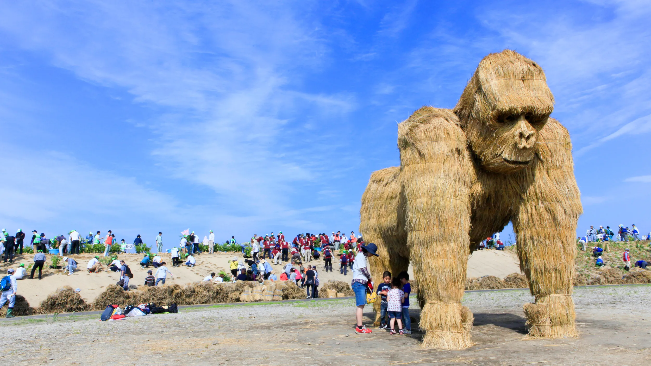 岩沼市は宮城県南東部の太平洋に面し西側は丘陵地帯で東側は平坦な平野です。「千年希望の丘全体構想」は、2011年東日本大震災の津波で被災した岩沼市沿岸部に丘をつくり、それをつなぐ園路に30万本の樹木を植えて森をつくる計画です。津波の威力を減衰させる役割のほかに、いざという時の緊急避難場所になります。2016年の春、この丘で「千年希望の丘植樹祭2016」が開催されました。植樹で用いられた敷わらを使って会場を盛り上げる祭のシンボル、森を守るゴリラ(モリラ)を制作しました。