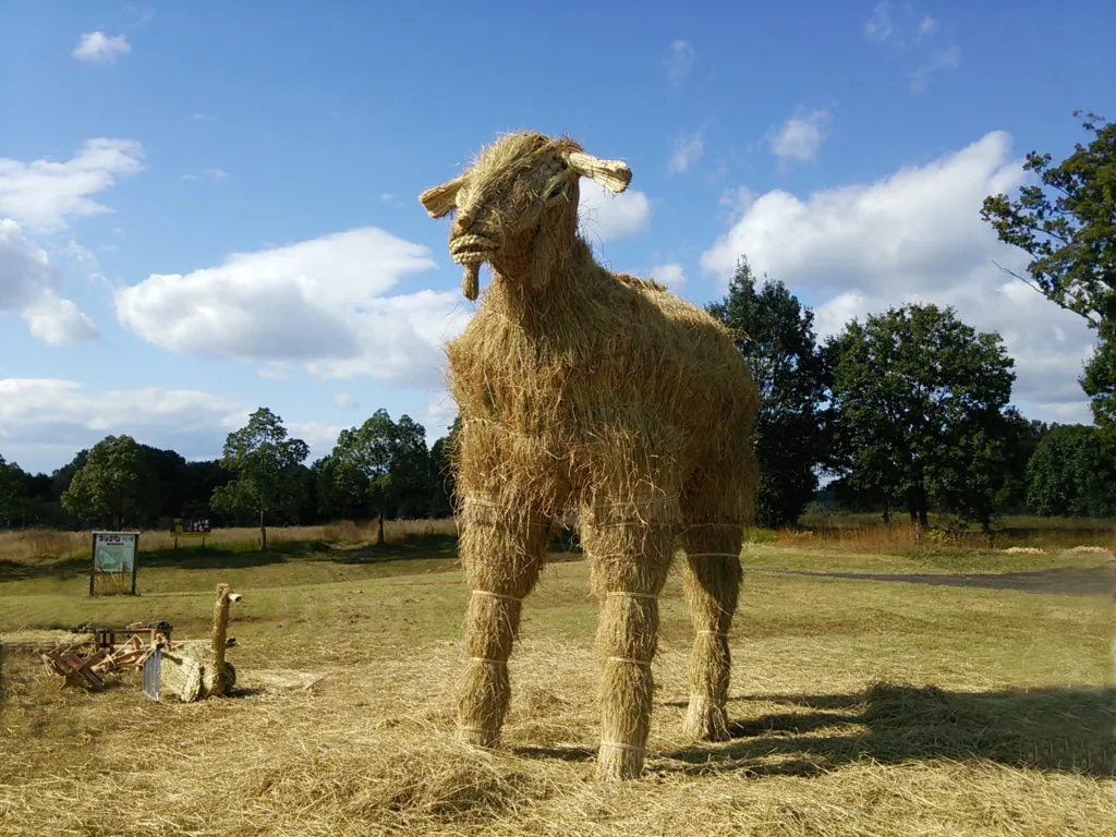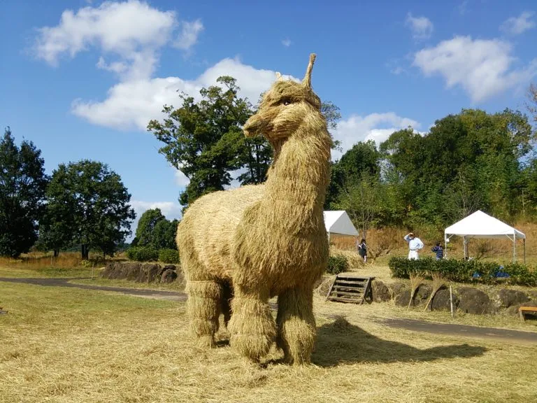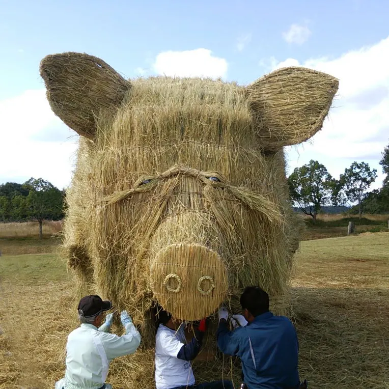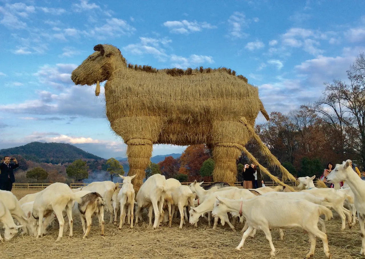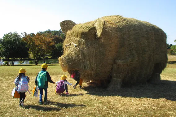 岐阜県南部に位置する美濃加茂市の日本昭和村。自然の中に懐かしい昭和30年代の里山を再現した施設です。園内の里山ふれあい牧場で飼育されている動物をモデルに地域の皆さんと「ヒツジ・アルパカ・豚と四阿」の4体を制作しました。大きな豚のお腹からは子供たちの笑い声が聞こえてきます。わらアートの内部が見学できるように、口から入ってお尻から出る通路を作りました。