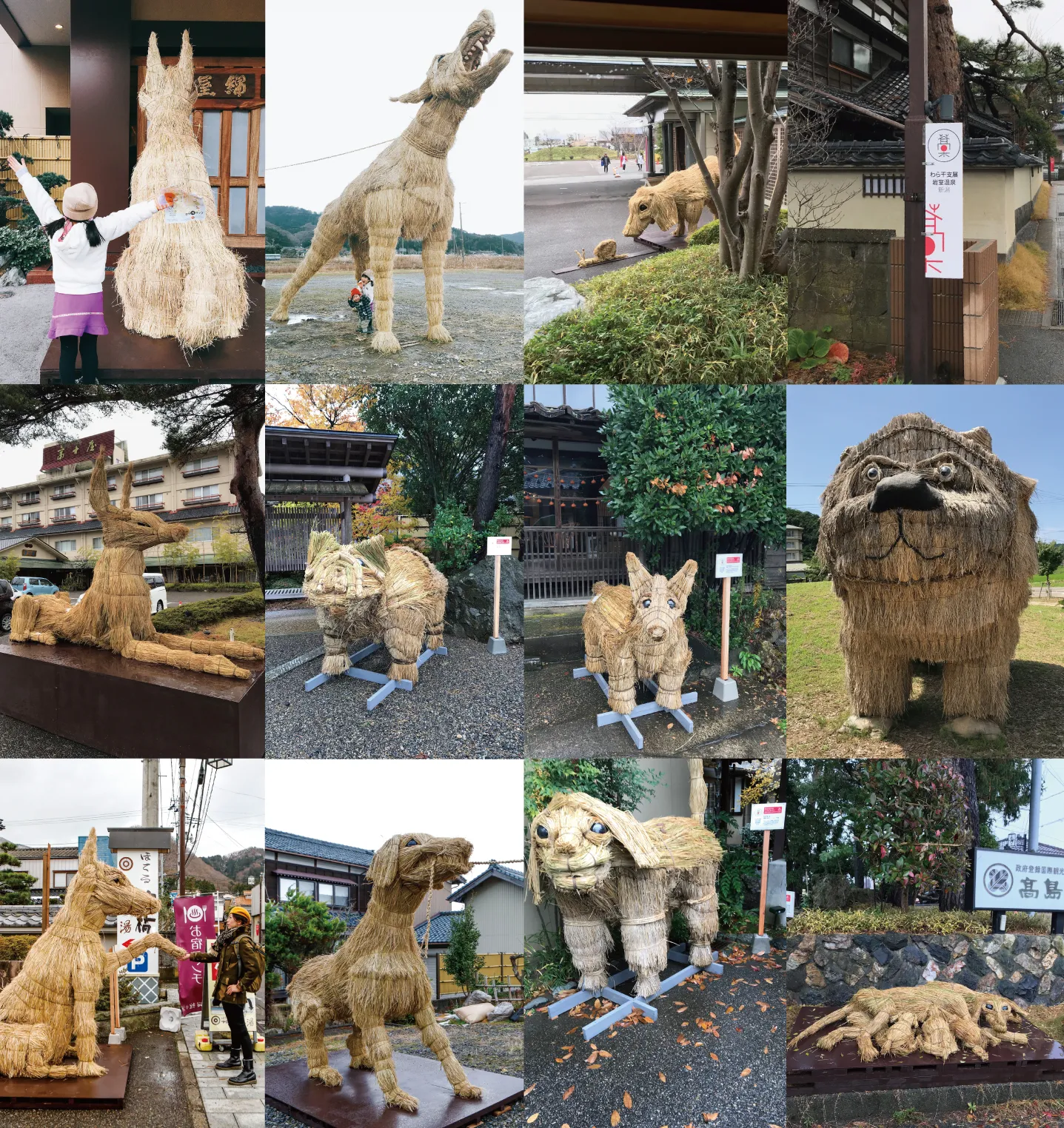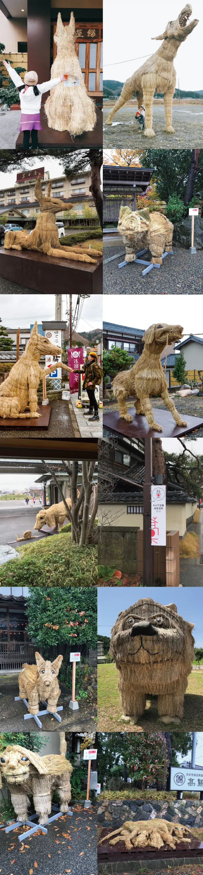 岩室温泉は、新潟市西蒲区にある「新潟の奥座敷」といわれる温泉地です。2006年11月、ここ岩室温泉で発祥したわらアートは、農村では身近な材料であるわら縄、箕、筵やトバなど生活の道具として使われてきた「稲わら」を用いた作品を制作し、毎年訪れる人々を楽しませてきました。2018年は「戌年」、干支をテーマにわら干支展を開催。新年を迎える11体の「戌」が温泉街や旅館の玄関に展示されました。これから毎年、わらで作られた十二支の動物が年末年始の温泉地を彩ります。