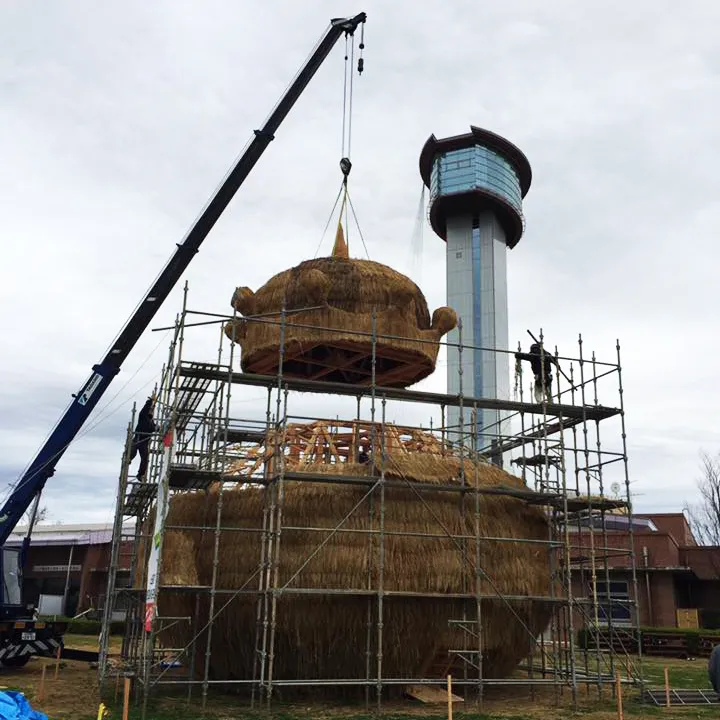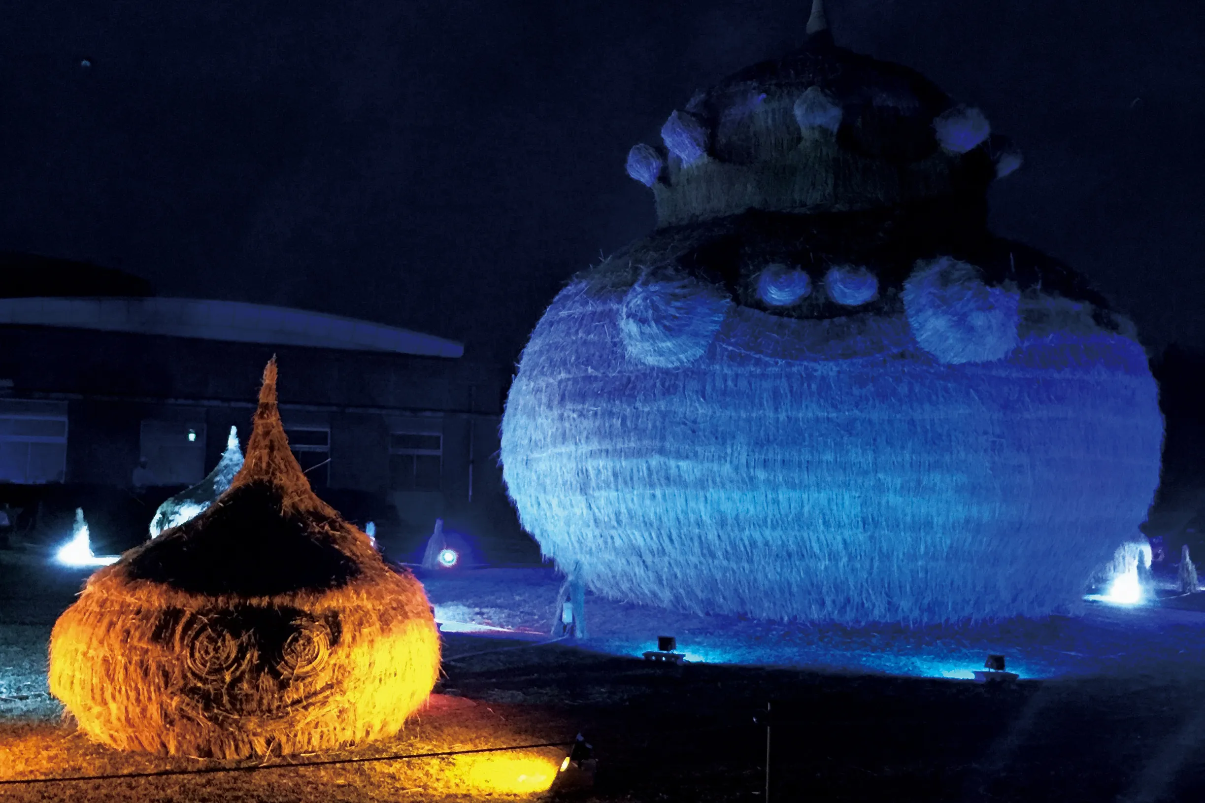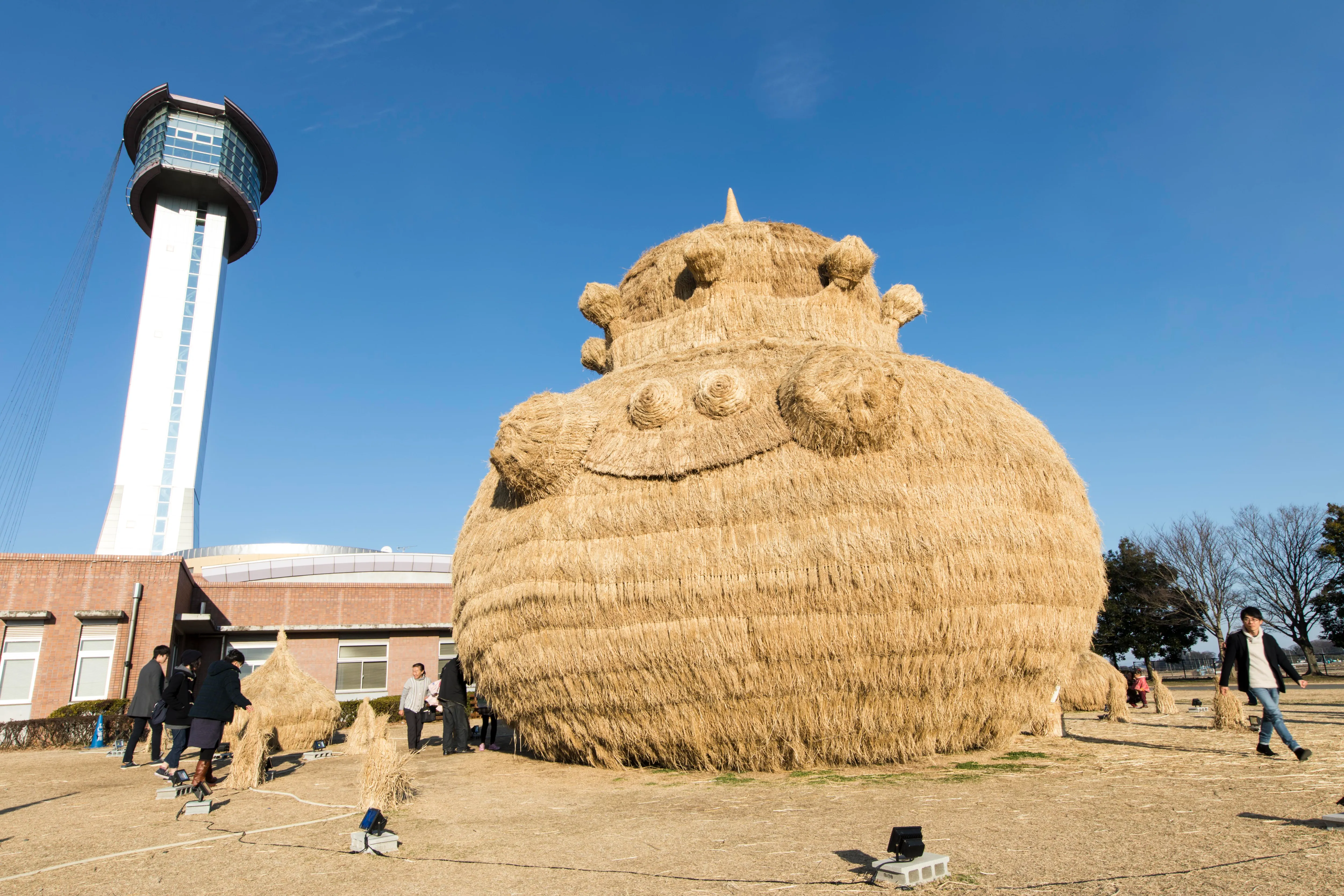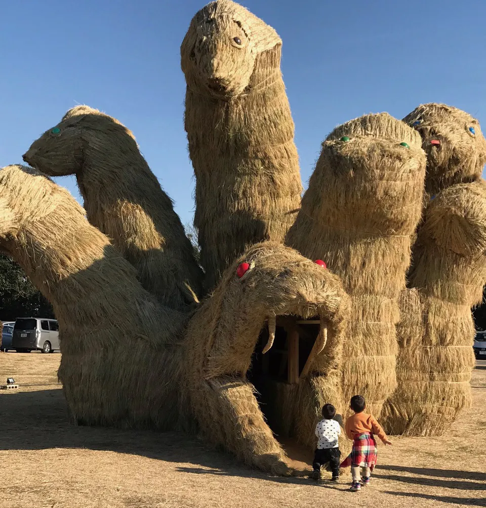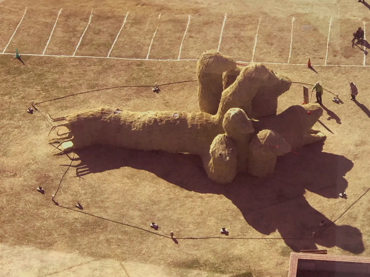 埼玉県北部に位置する行田市の古代蓮の里では、2014年から市職員やボランティア、地元建設業者や造園業者が参加して「日本一巨大なわらアート」を作っています。2016年は、田んぼアートの絵柄になった「ドラゴンクエスト」のキャラクターをモチーフにして「スライム」3体と「キングスライム」1体を作りました。「スライム」は、高さ2メートル、「キングスライム」は、高さ9.3メートル 幅8.8メートルと特大サイズです。2017年は、「ヤマタノオロチ」をテーマに、スサノオノミコトの神話に登場する8つの頭を持つ生き物を作りました。大きさは全長18メートル、高さ6メートル。大蛇の口から入っておなかの内部を見学することができます。夜間はライトアップされ古代蓮の里の名物となりました。
