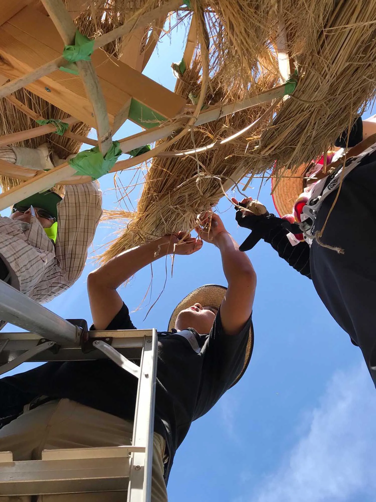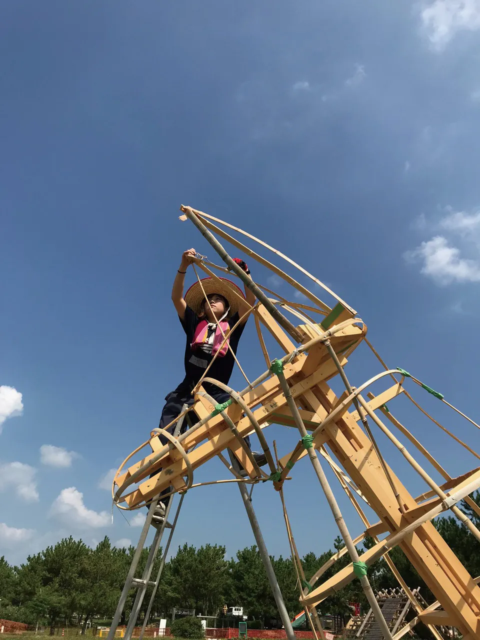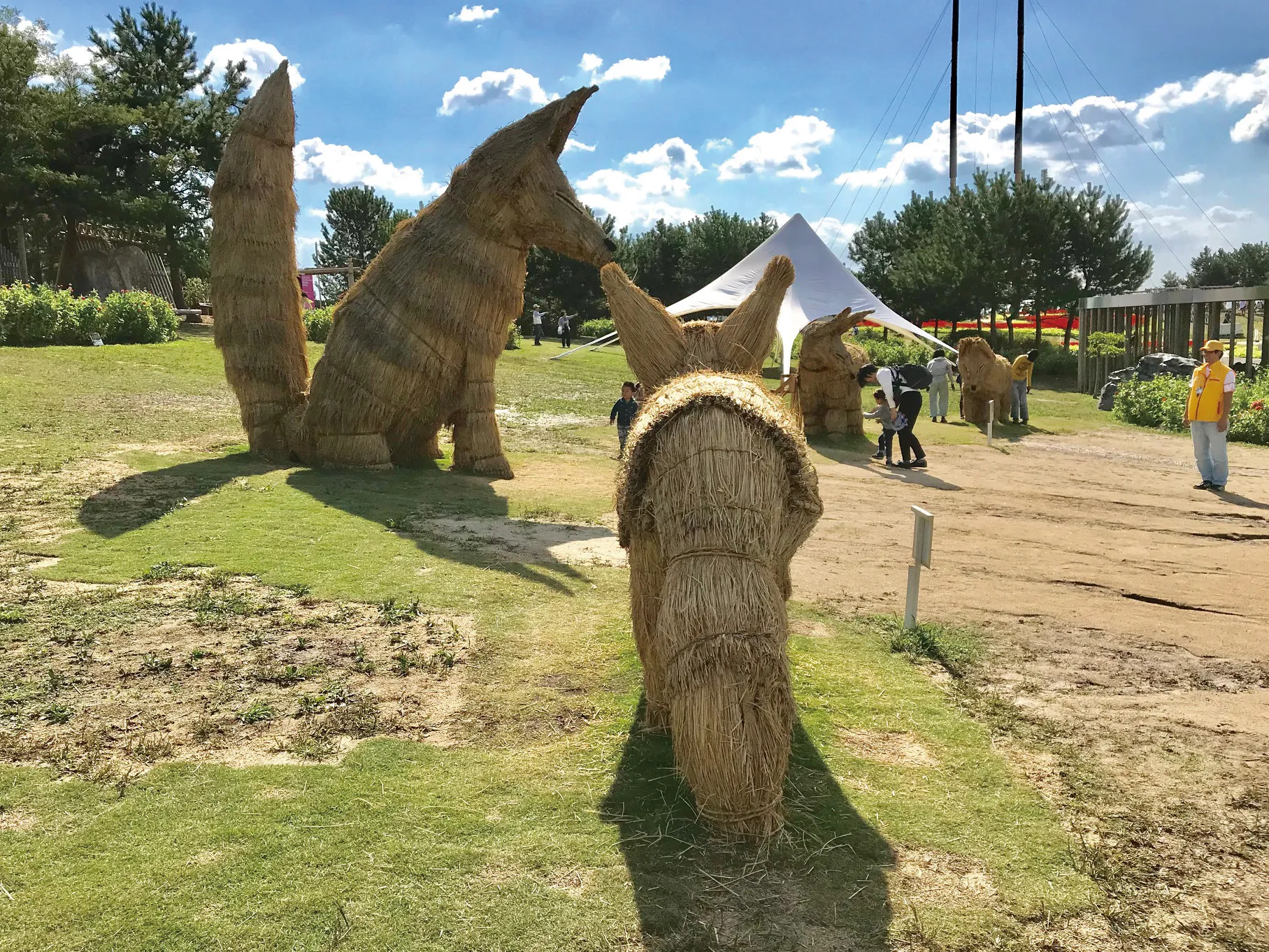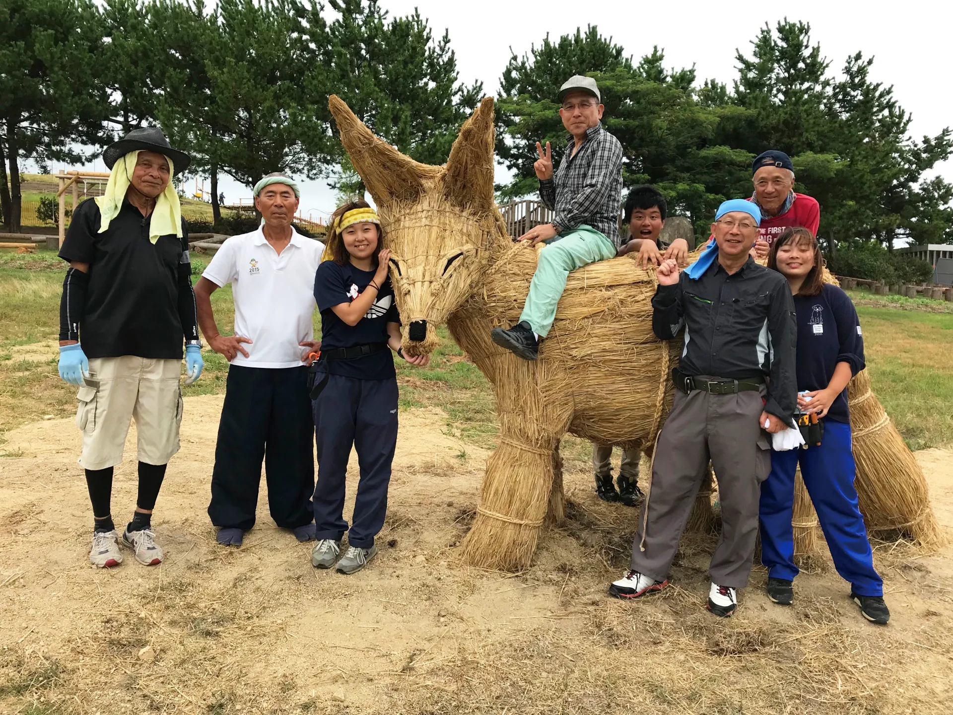 山口県のほぼ中央部に位置する山口市きらら博記念公園で第35回全国都市緑化やまぐちフェア「山口ゆめ花博」が開催されました。園内にある「山の外遊びゾーン」でキツネの親子4体を作りました。モチーフは地元湯田温泉のシンボルの白狐です。目の前に広がる瀬戸内海を見つめる親キツネは高さ4メートル、子ギツネが2メートルほど。わらは山口市の県農業試験場で栽培された地元産を使用しました。青空の下で多くの子供たちが子ギツネの背中に乗ったり、わら付けのワークショップに参加したり思い思いに楽しんでいました。