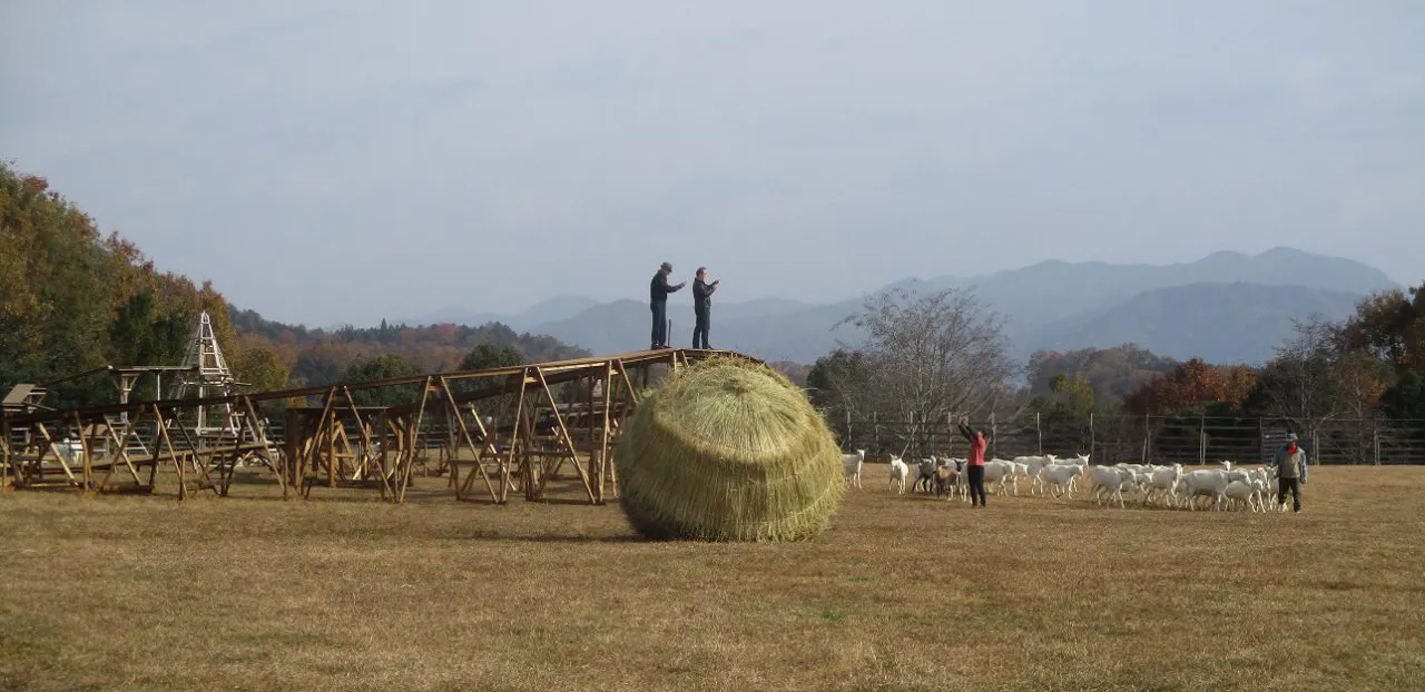 美濃加茂市は岐阜県の南部に位置します。県営「ぎふ清流里山公園」 は昭和の里山をイメージした都市公園。この中に環境保全を実践する場として「里山ふれあい牧場」があります。ここで飼育されている「ヤギさん除草隊」は、公園や企業の敷地、耕作放棄地などに繁茂している草を食べて、里山をまもり景観を保つ活動をしています。 今年はやぎ牧場に「ヤギサークル」と「わらボール」を設置。ヤギサークルに登ったヤギたちは、わらボールを転がしながら一瞬で「お食事」をしました。