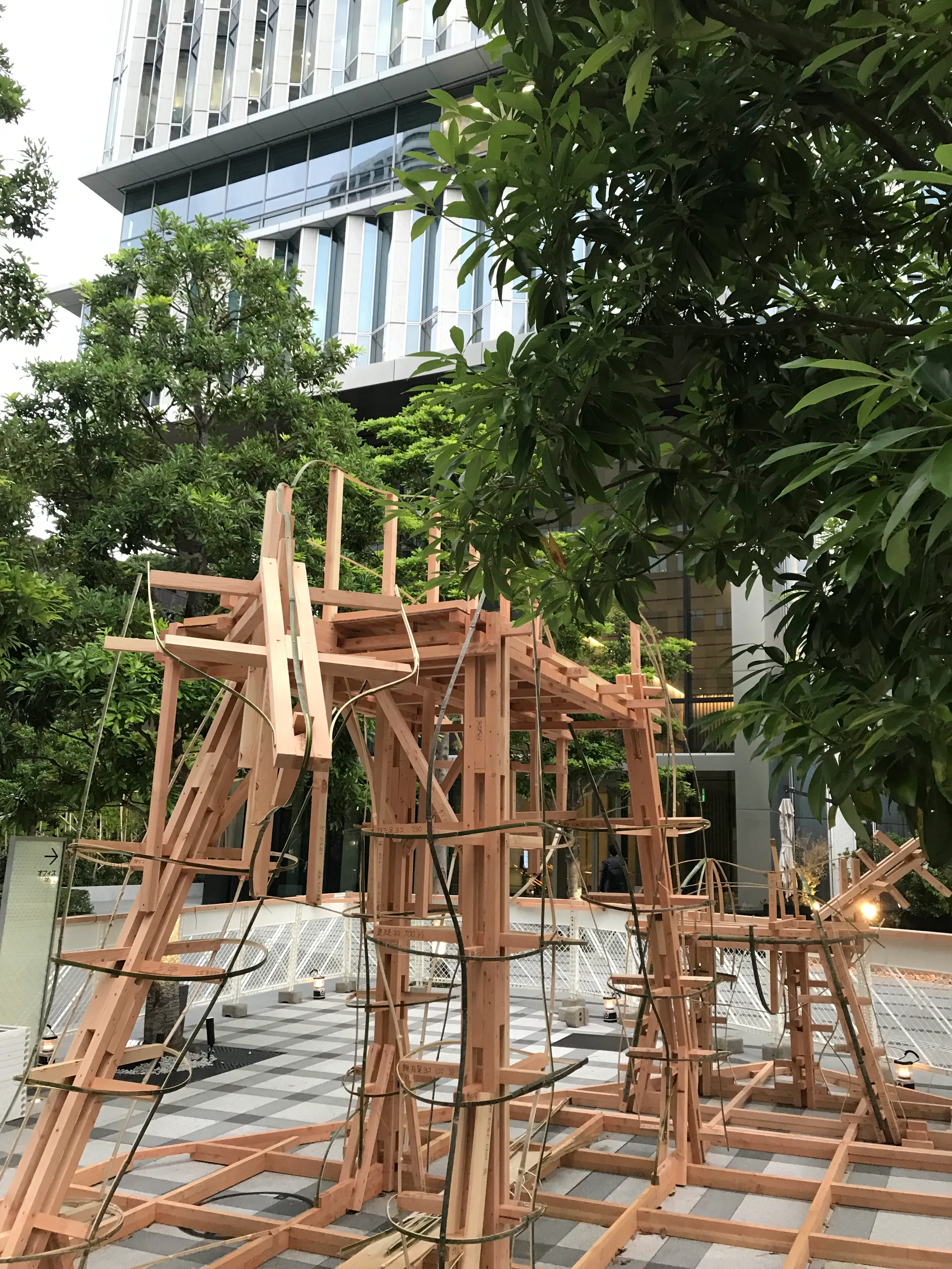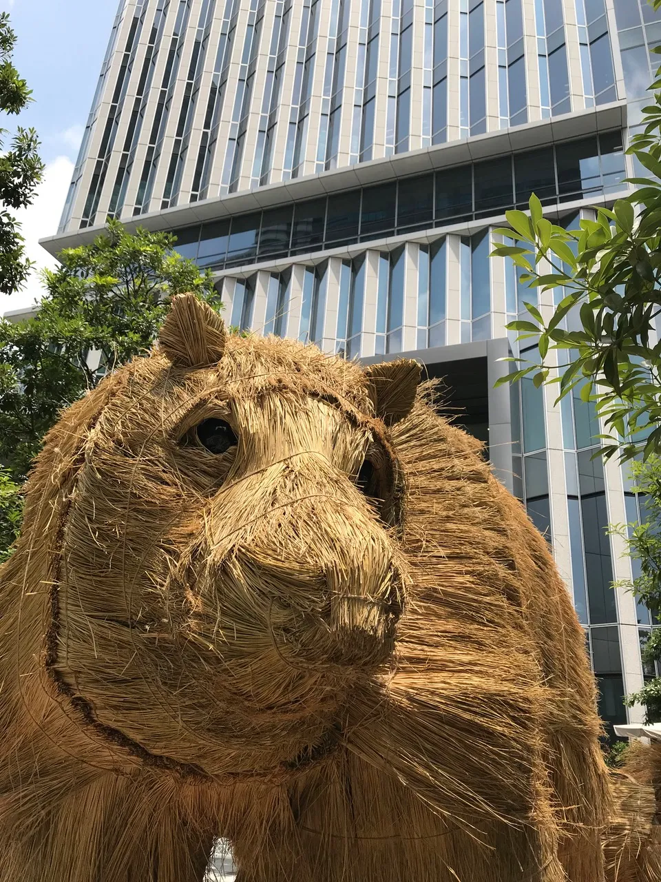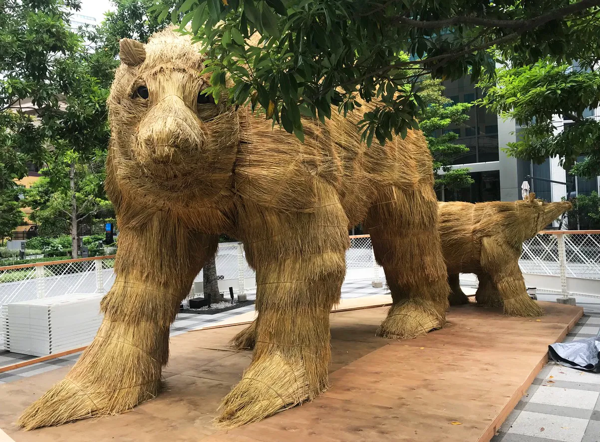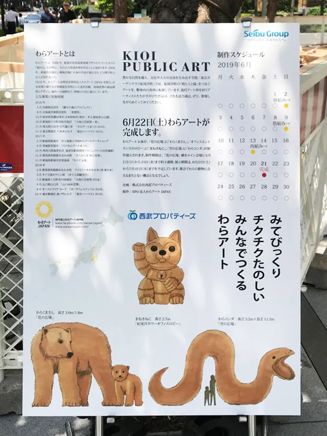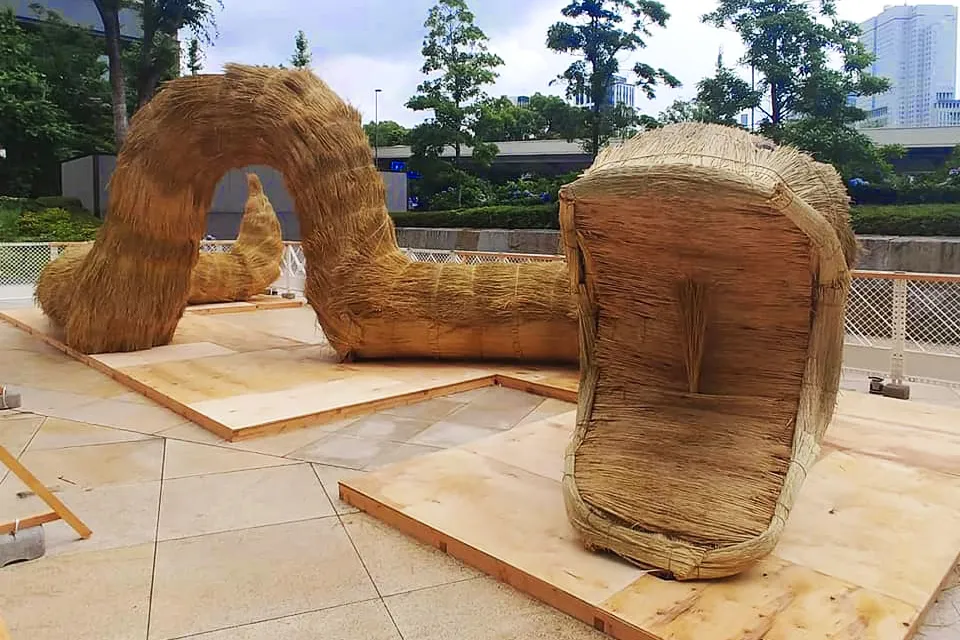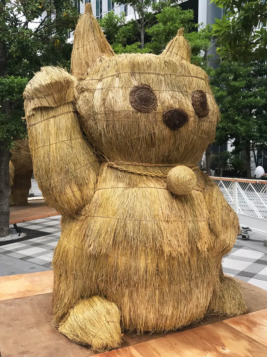 アート散歩ができる街、東京ガーデンテラス紀尾井町で「熊の親子」「招き猫」「大蛇」4体のわらアートを制作しました。オープンテラスの「花の広場」と、弁慶壕を見下ろす「空の広場」に展示され、高層ビルに囲まれた市街地にわらの素材とかたちが和やかな空間を演出しました。