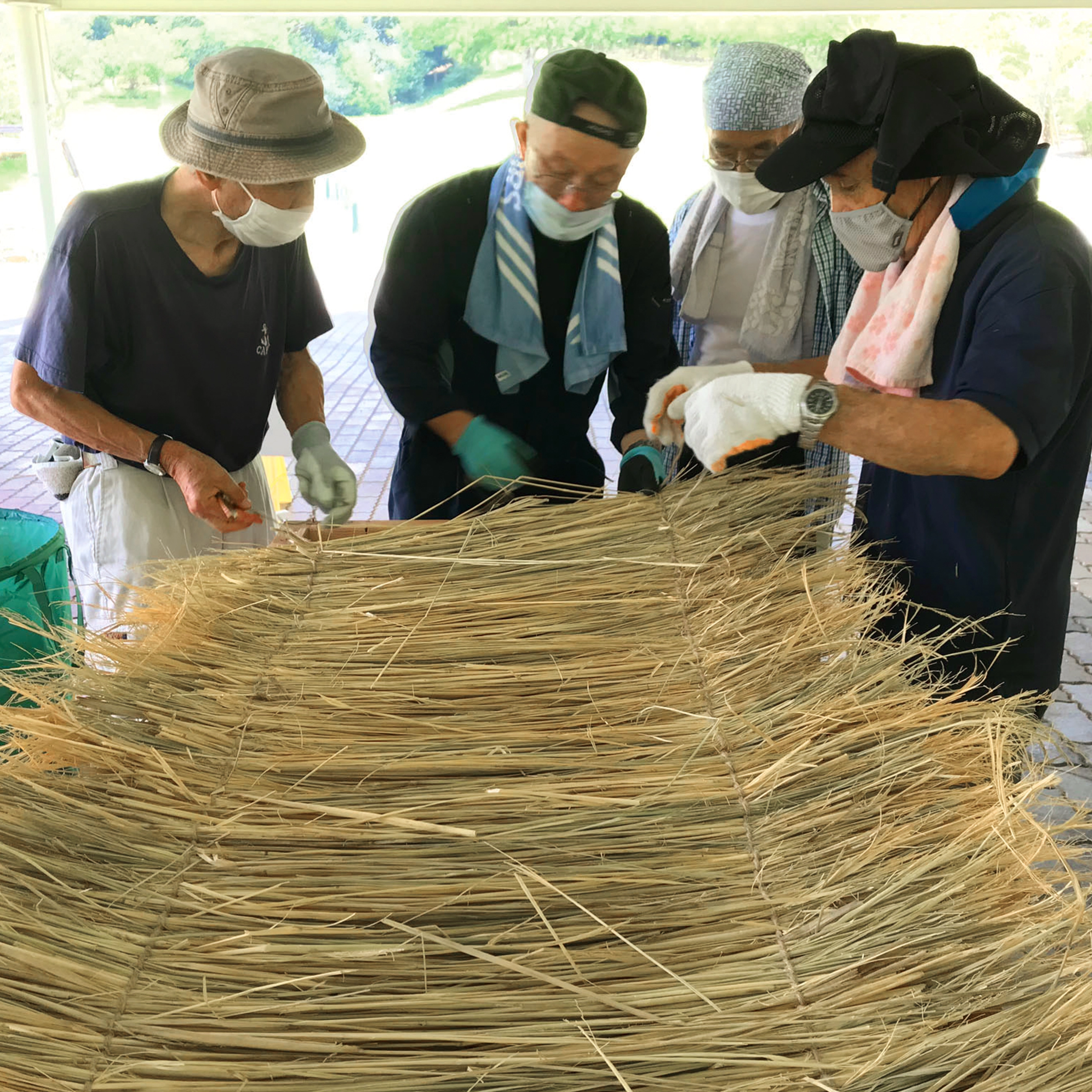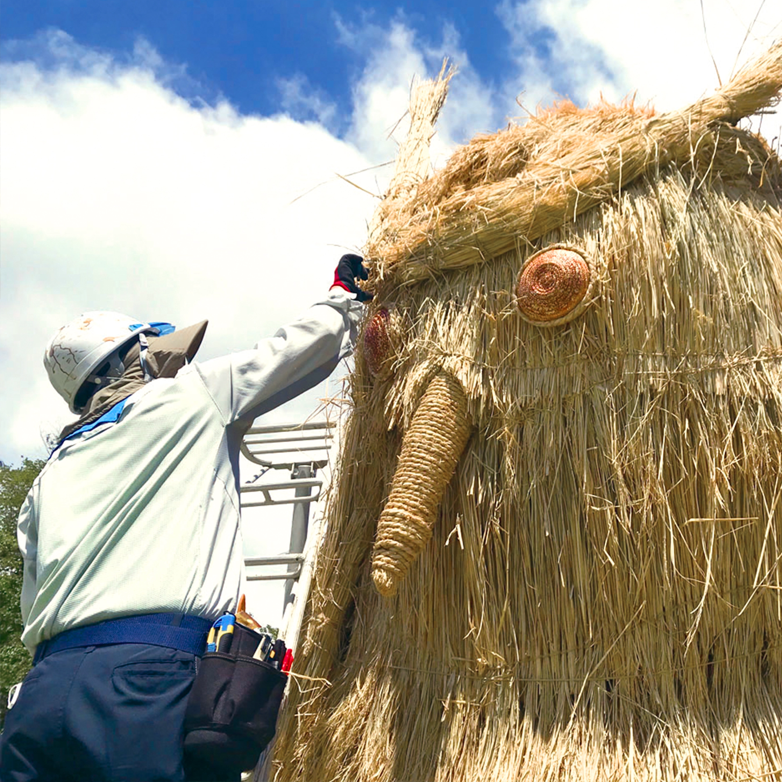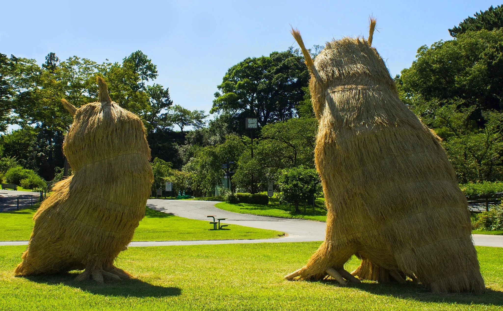はままつフラワーパークは、静岡県の浜名湖畔にある自然の地形を活かして作られた植物園で別名を花の図書館と呼ばれています。また、園内に点在する「見立て」をテーマにしたアート作品群は公園の大きな魅力の一つです。開園50周年記念事業の一つとして「皆でわらアートを作ろう」プロジェクトが企画され、園内に生息する生き物を題材に「木菟の親子」を地域のボランティアと共に制作しました。