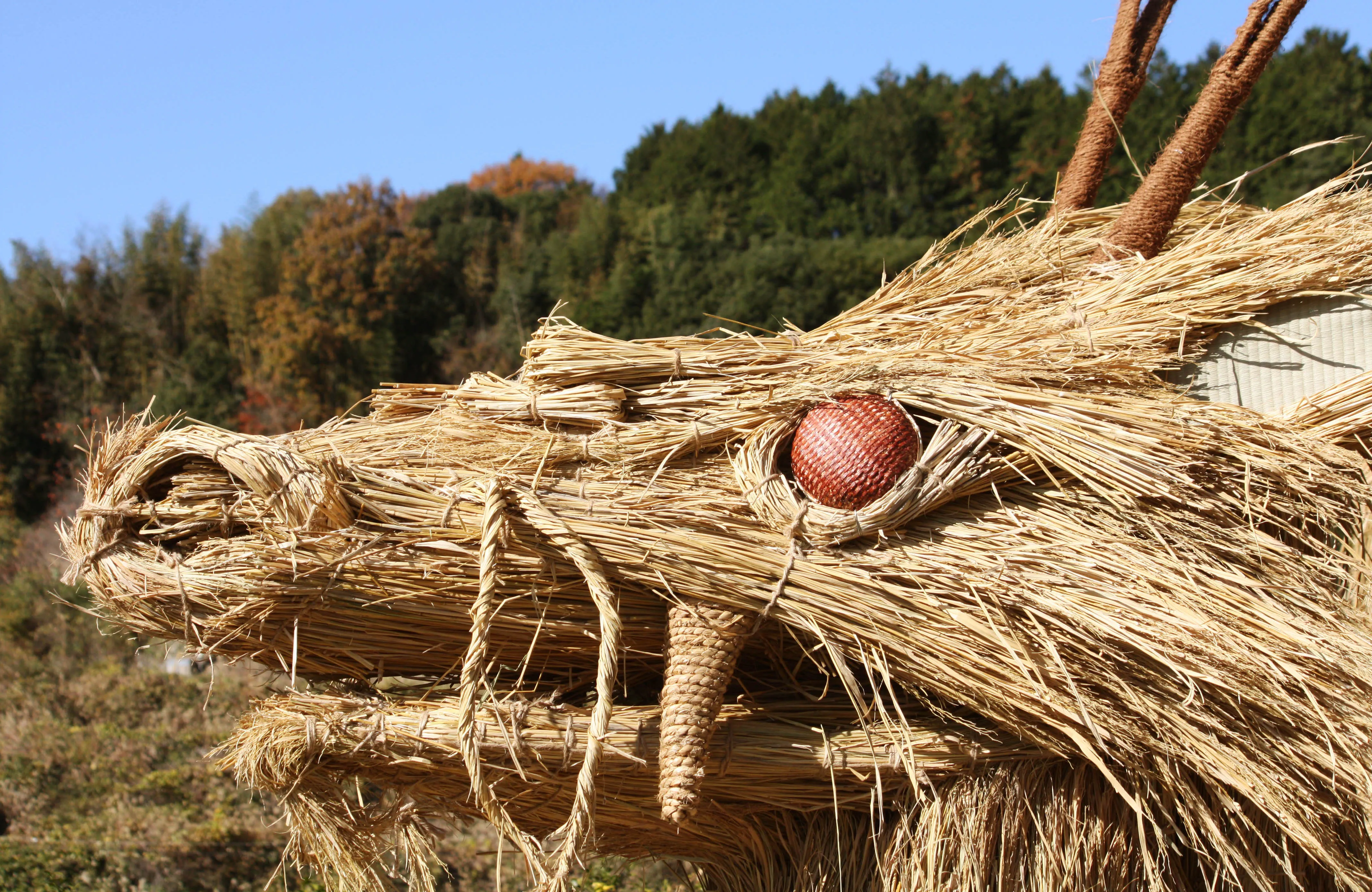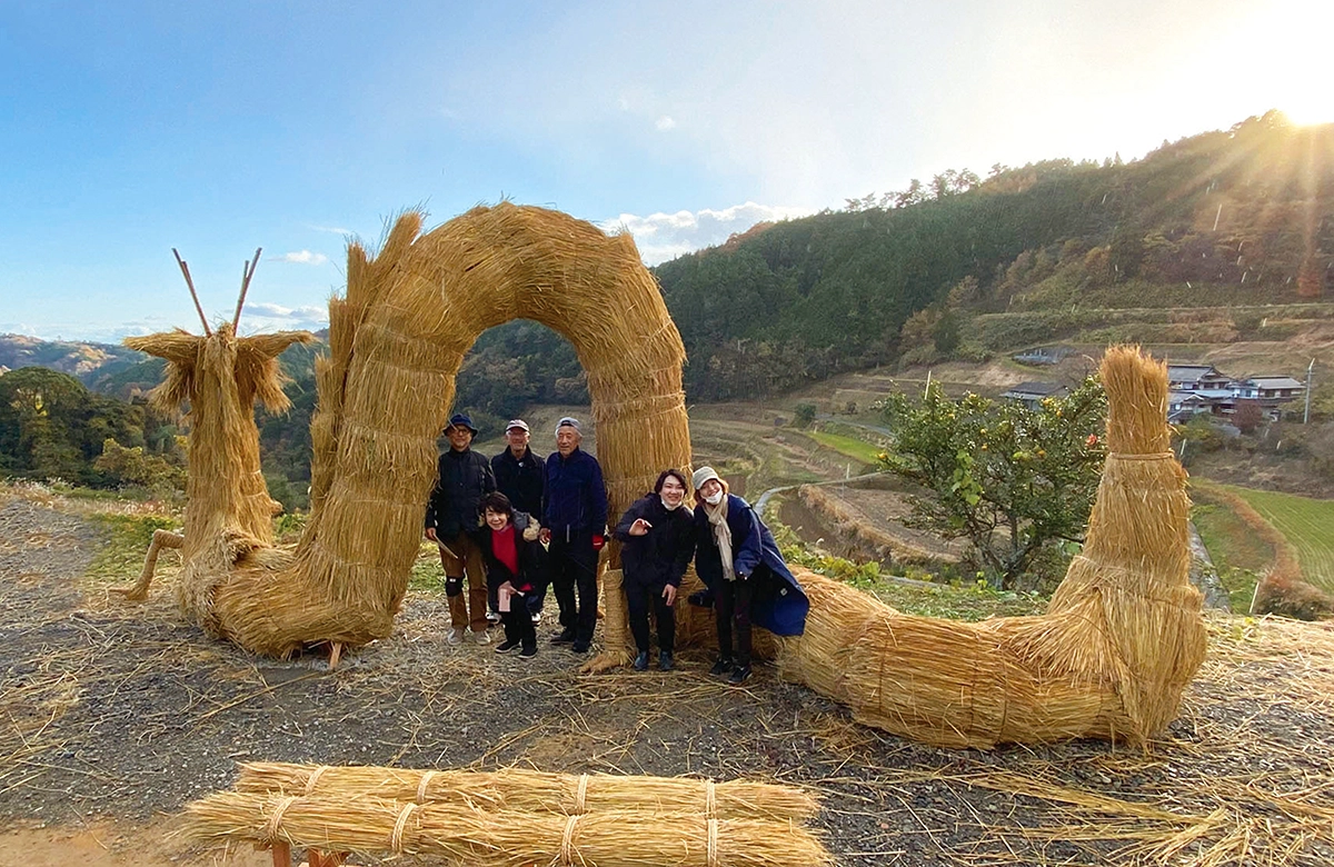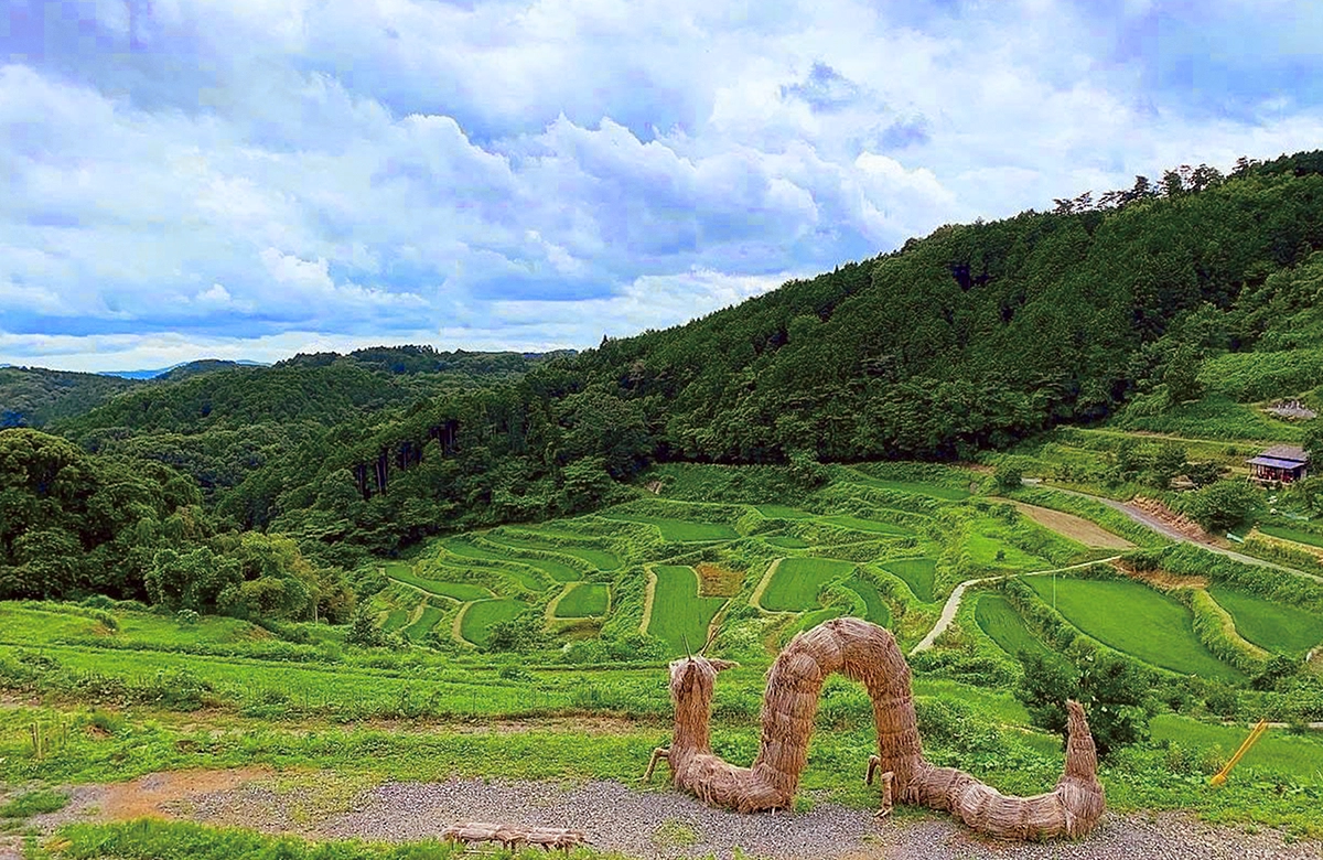 日本の棚田百選に選ばれた上籾の棚田を見下ろす高台に「竜神」と「籾の輪くぐり」を制作しました。竜の大きさは高さ3.5メートル長さ7.5メートル。この地区の大地と豊穣の守り神で、山から田んぼに水を吐いたと言い伝えられています。また、見晴らし台に直径2メートルの輪くぐり8体を設置しました。それぞれの輪をくぐれば、それぞれの願いが叶いますようにと。