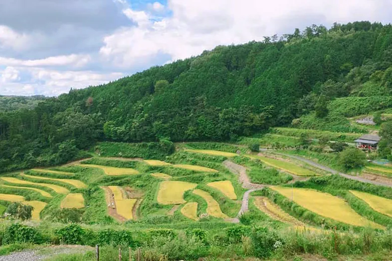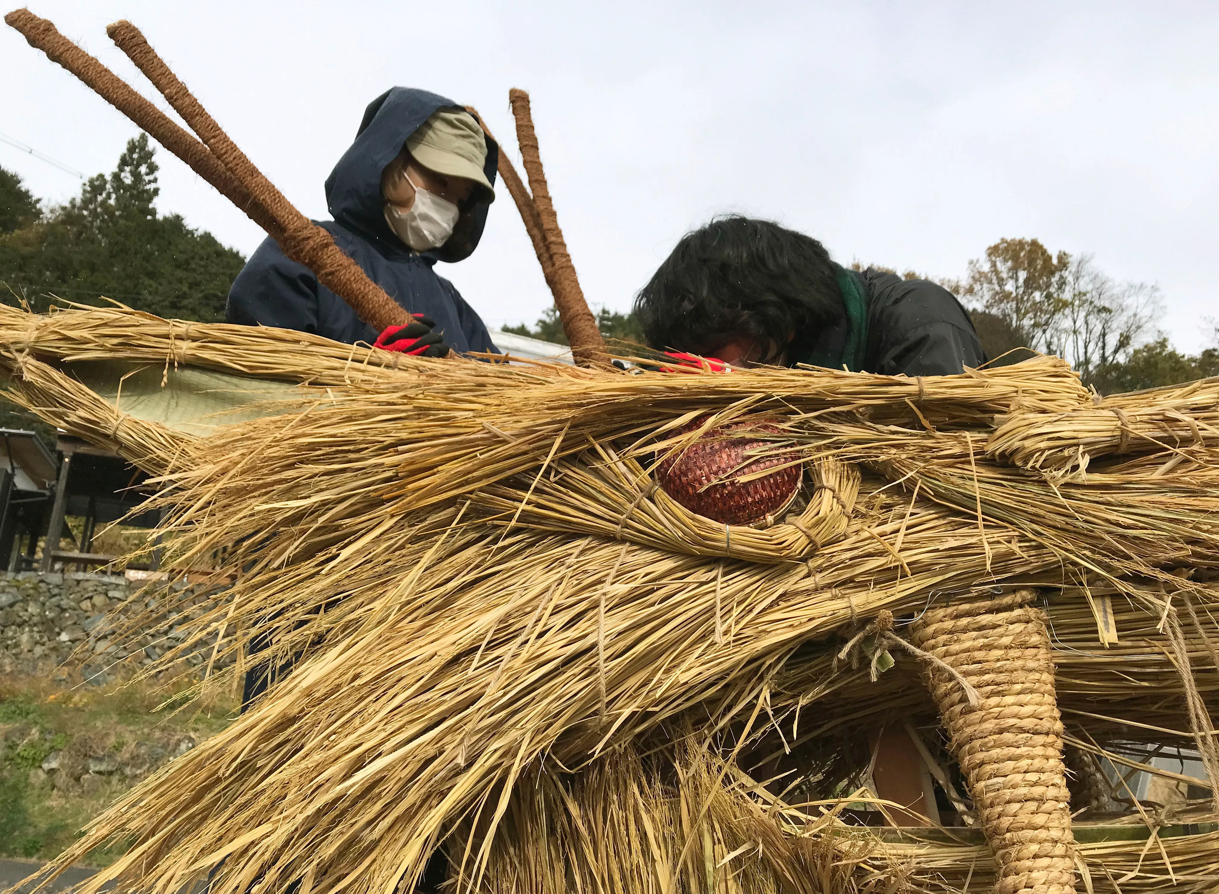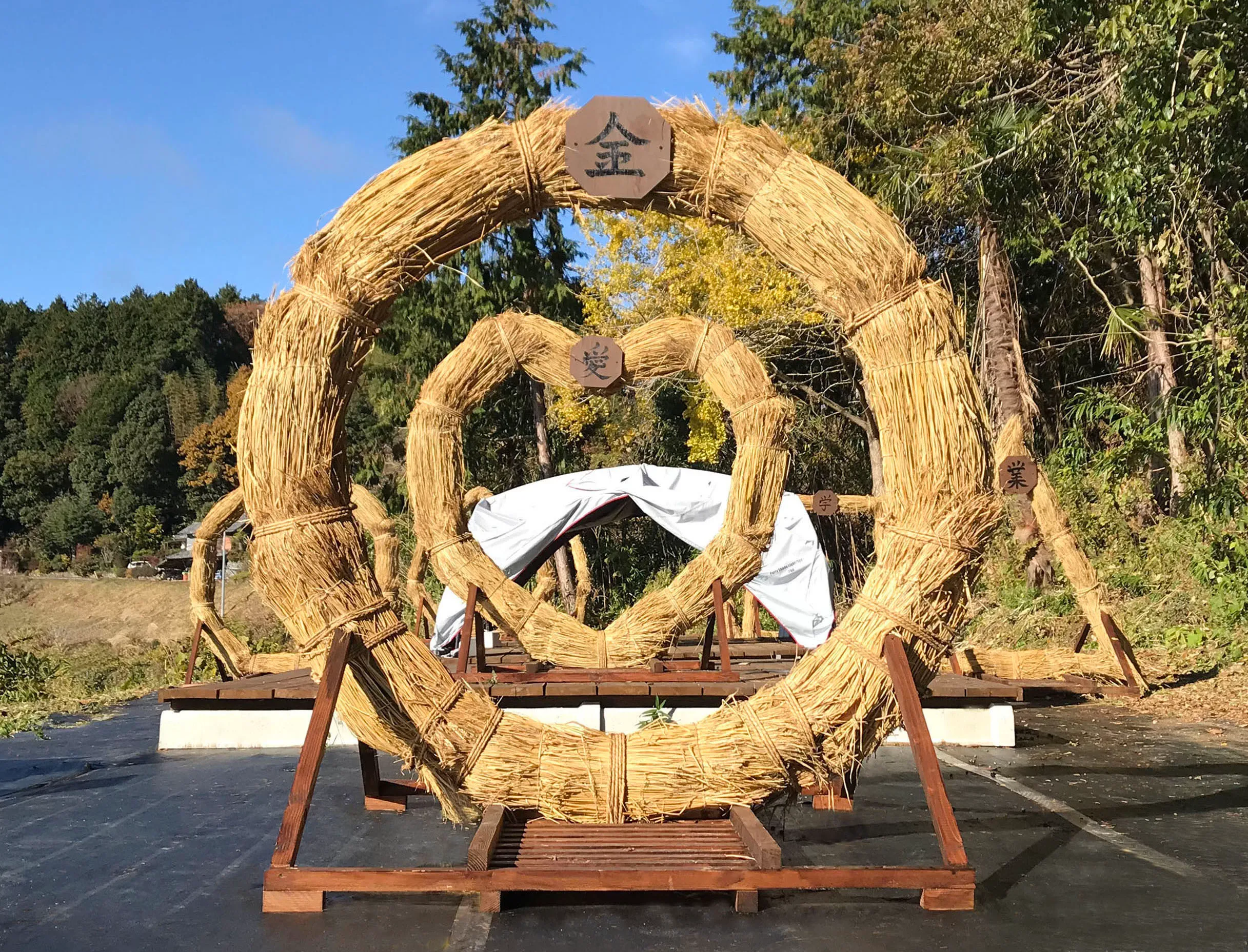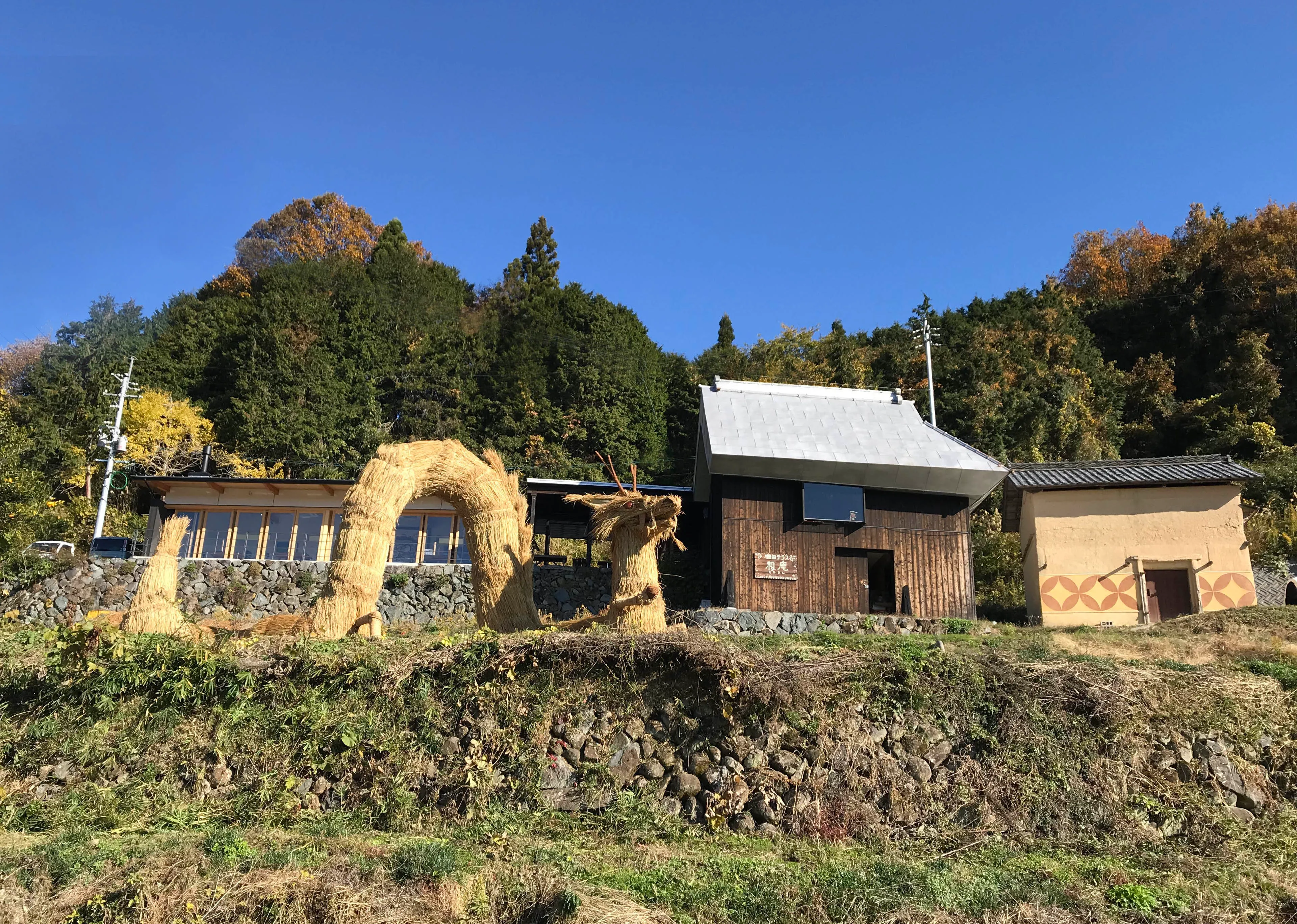 日本の棚田百選に選ばれた上籾の棚田を見下ろす高台に「竜神」と「籾の輪くぐり」を制作しました。竜の大きさは高さ3.5メートル長さ7.5メートル。この地区の大地と豊穣の守り神で、山から田んぼに水を吐いたと言い伝えられています。また、見晴らし台に直径2メートルの輪くぐり8体を設置しました。それぞれの輪をくぐれば、それぞれの願いが叶いますようにと。