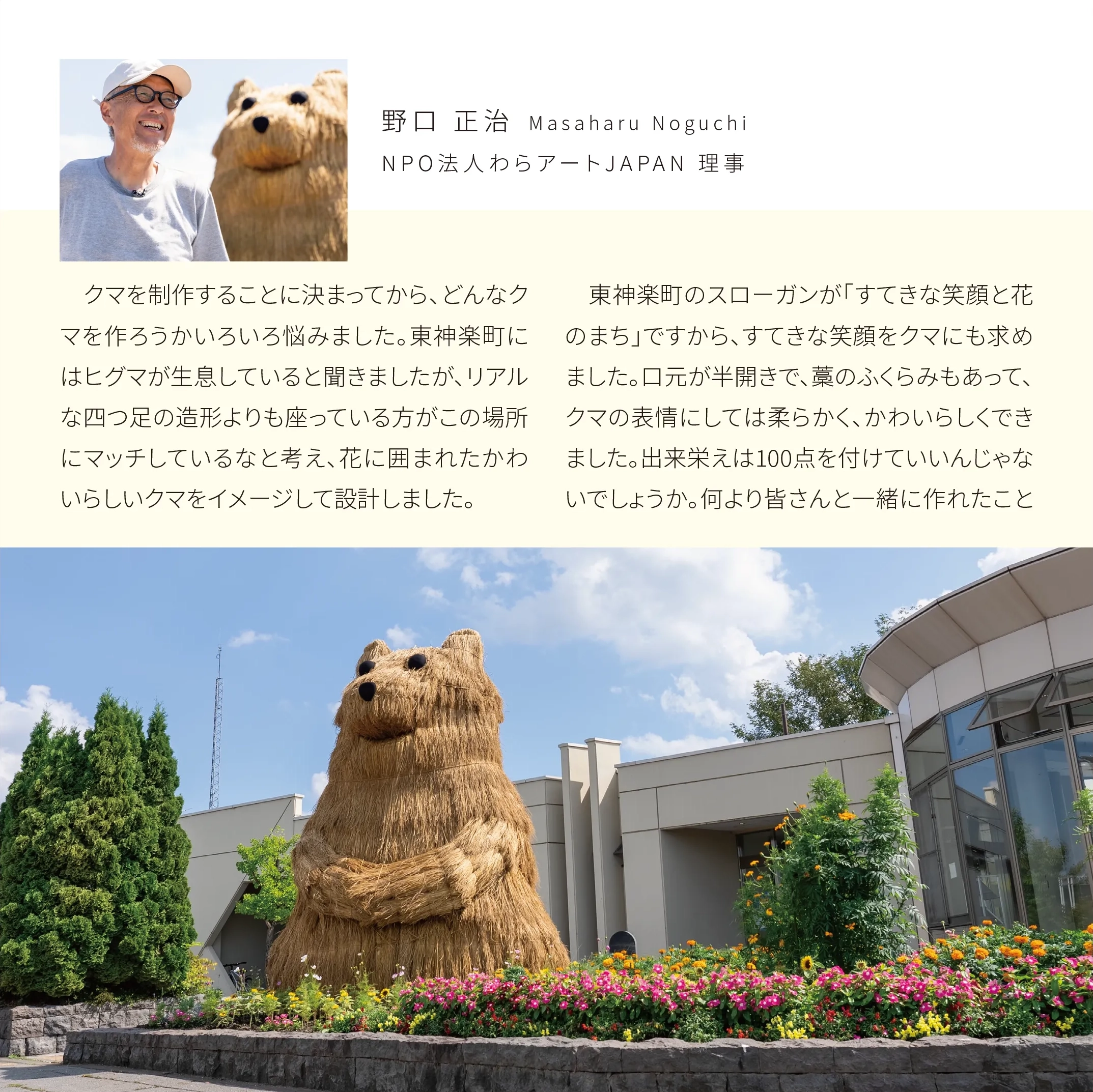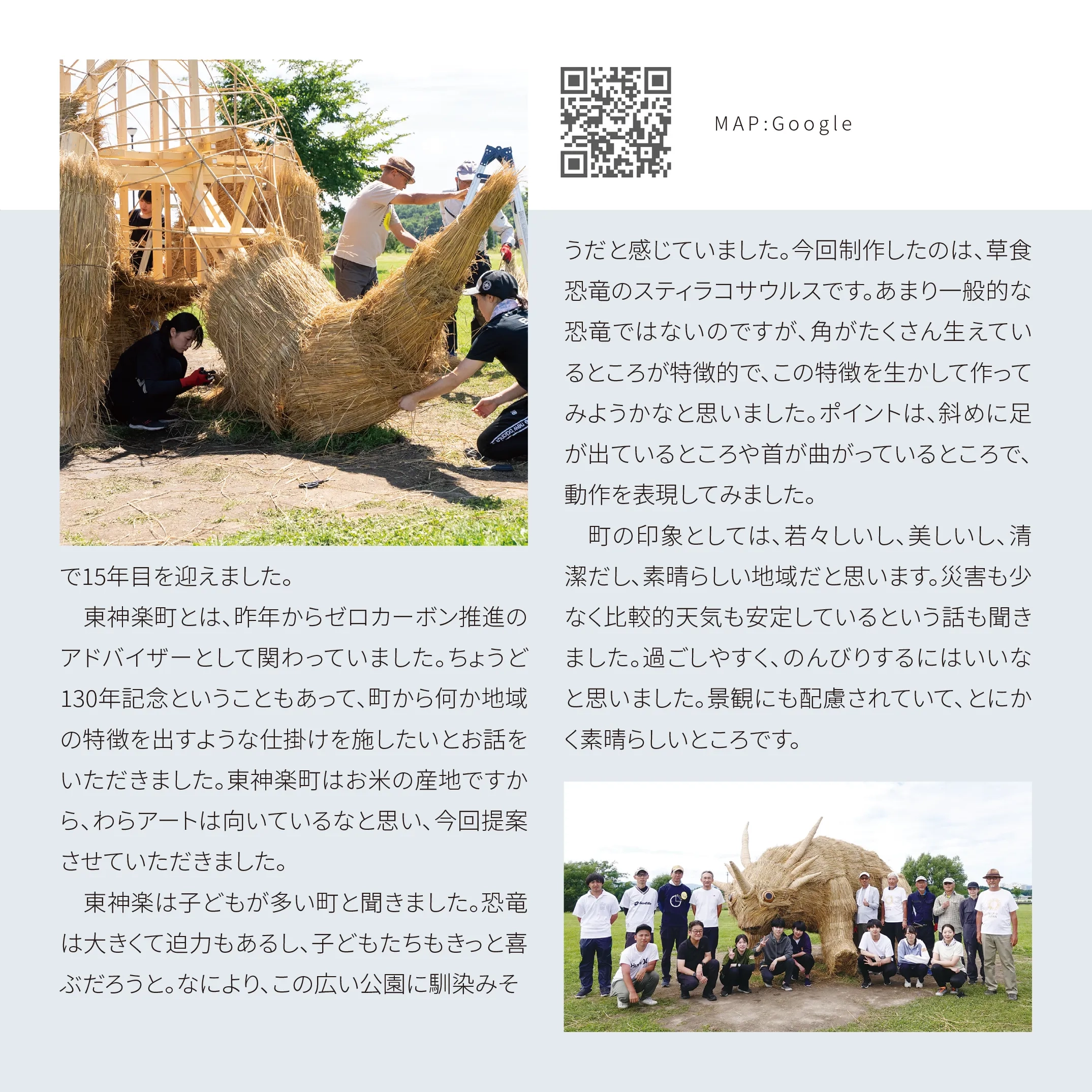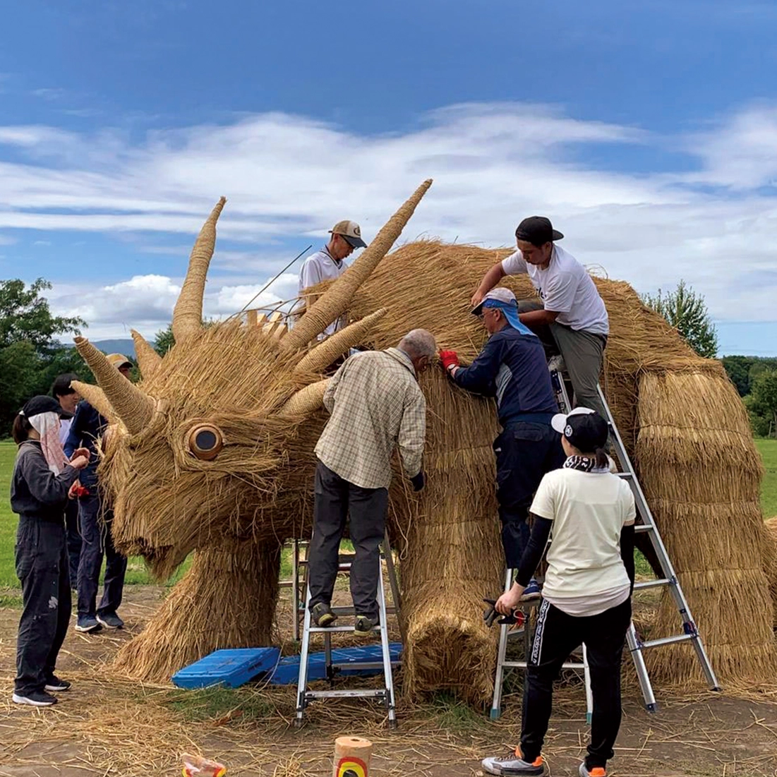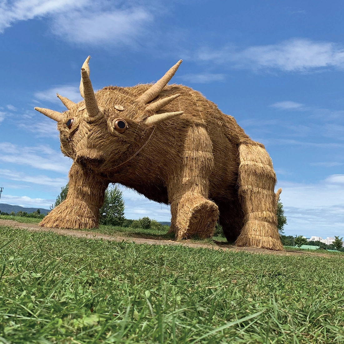 花の町東神楽に現れた熊「かぐらベア」と角竜「スティラコサウルス」。町の開拓が始まって130年の記念事業のひとつとして、町産米の稲わらを編み、骨組みに取付け、地域のボランティアや町役場の職員と共に制作しました。熊は町の中心のバスセンターでおもてなし。角竜は郊外の公園広場に設置しました。