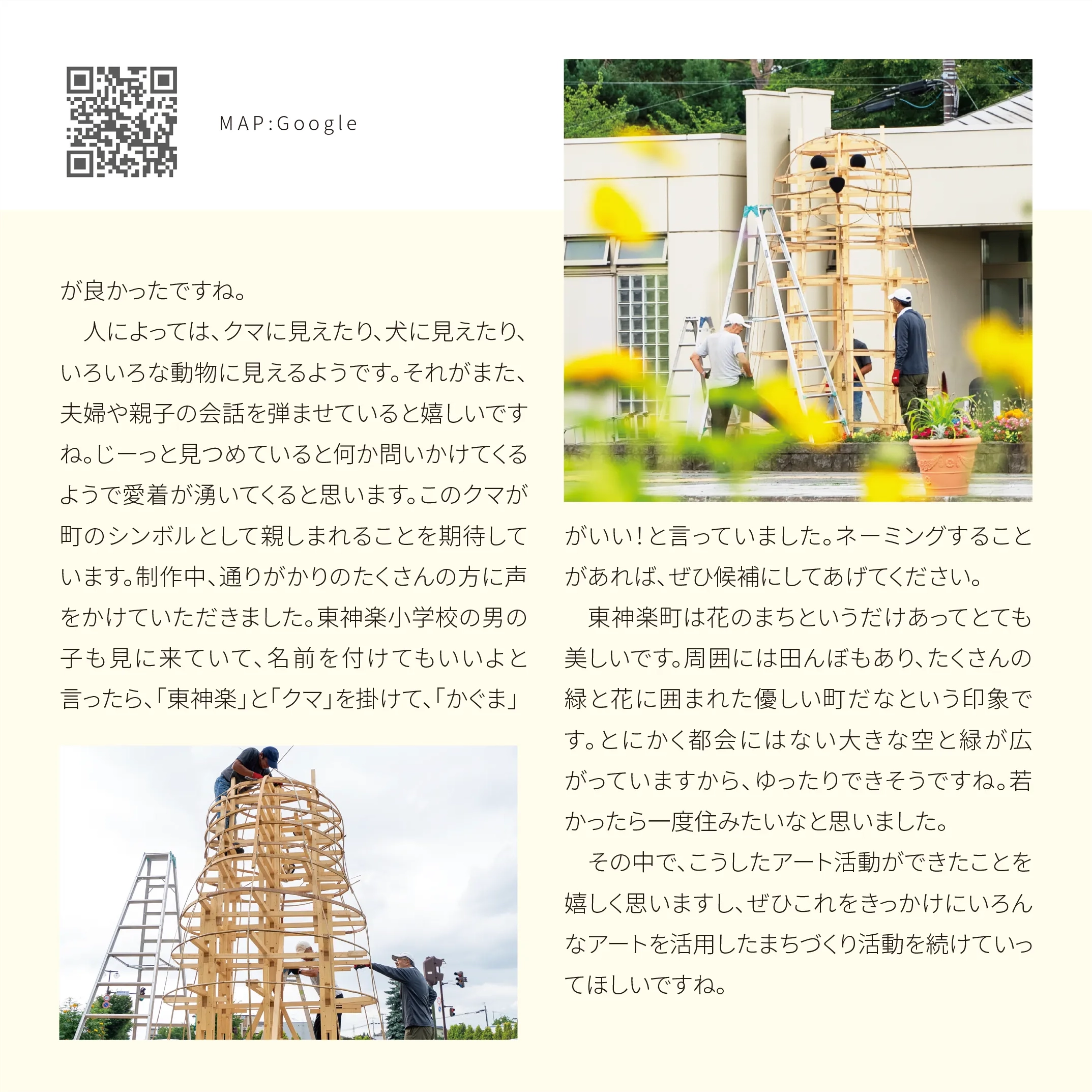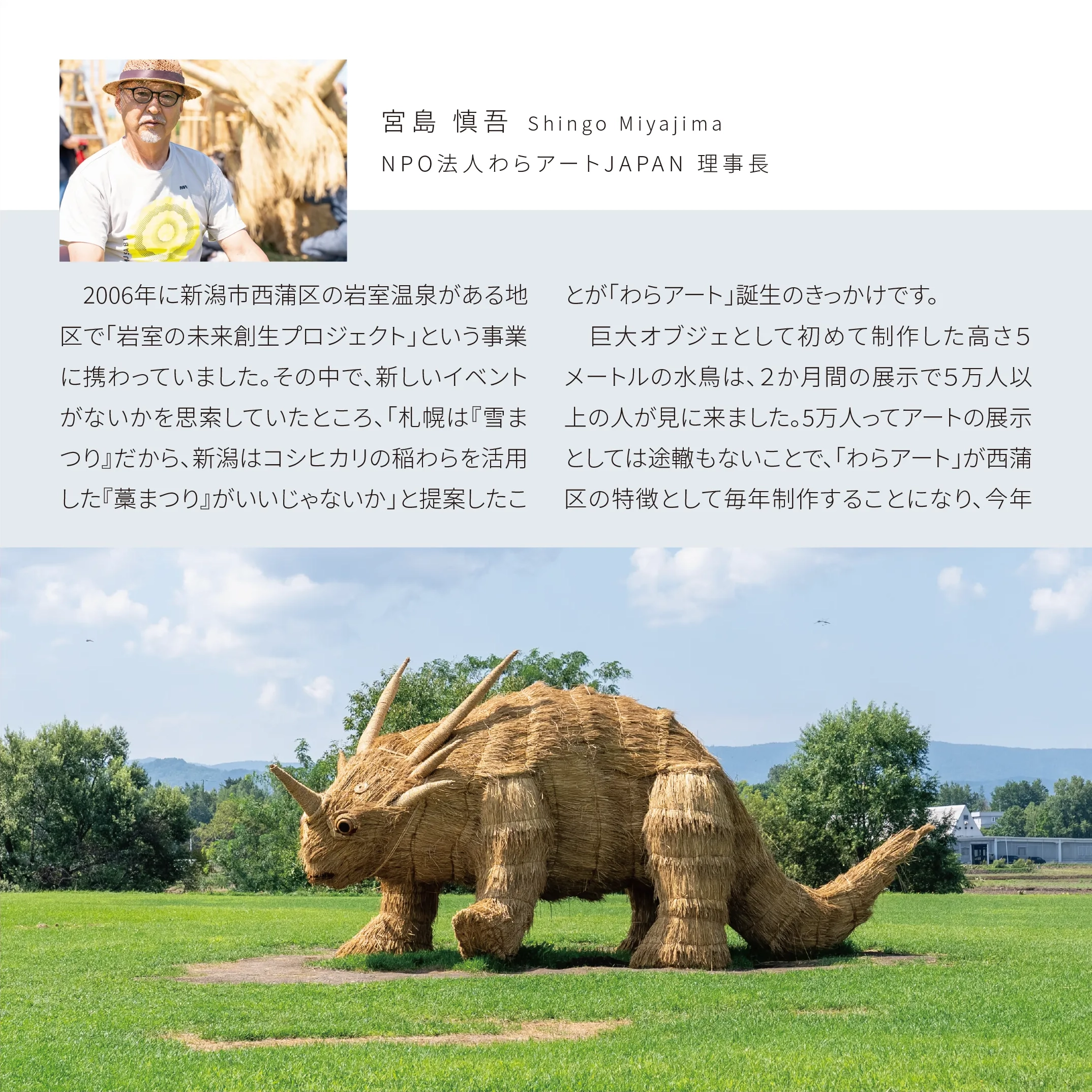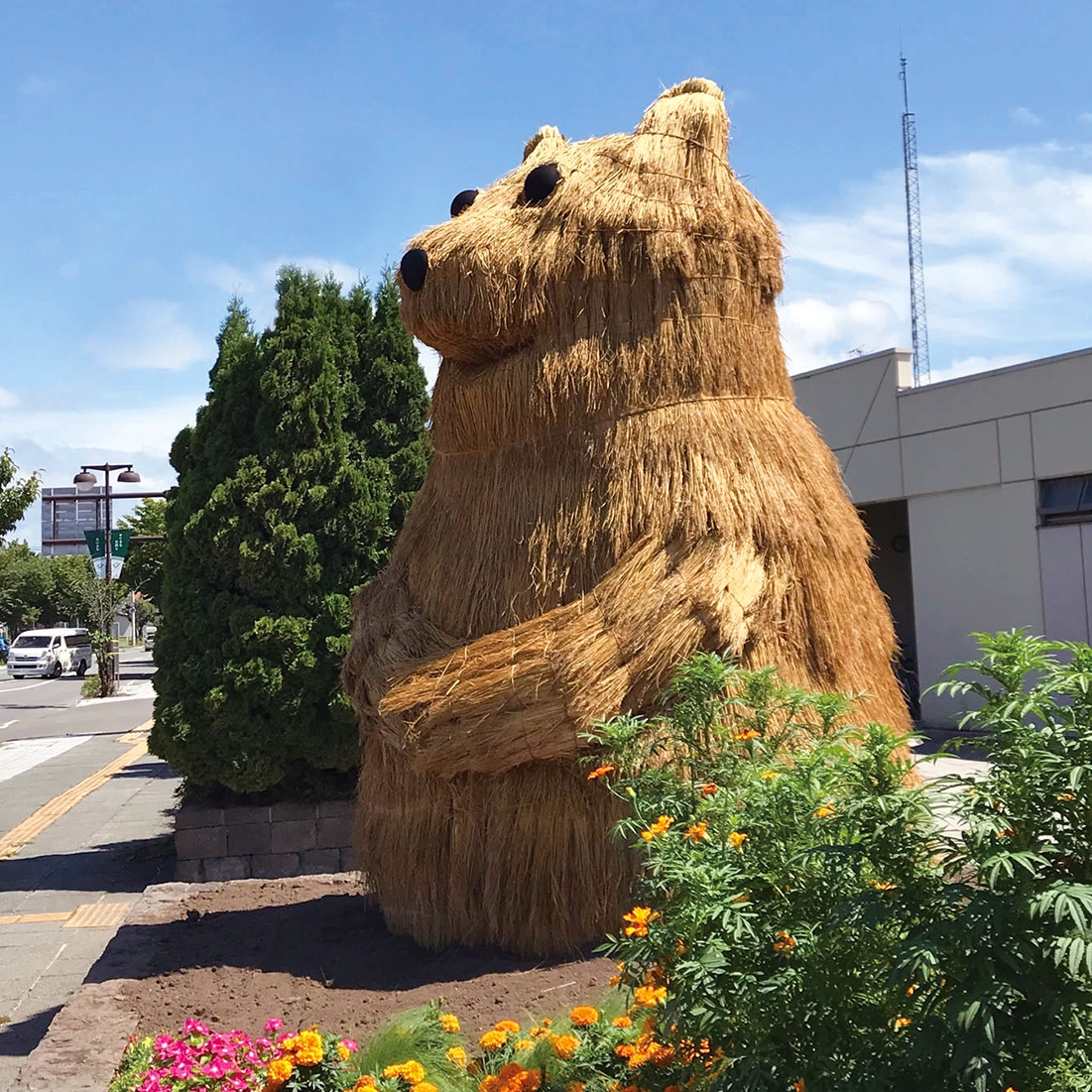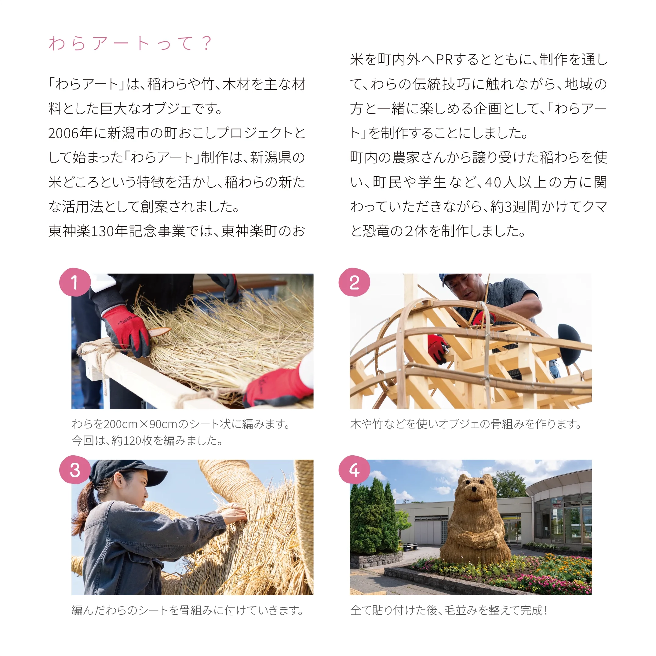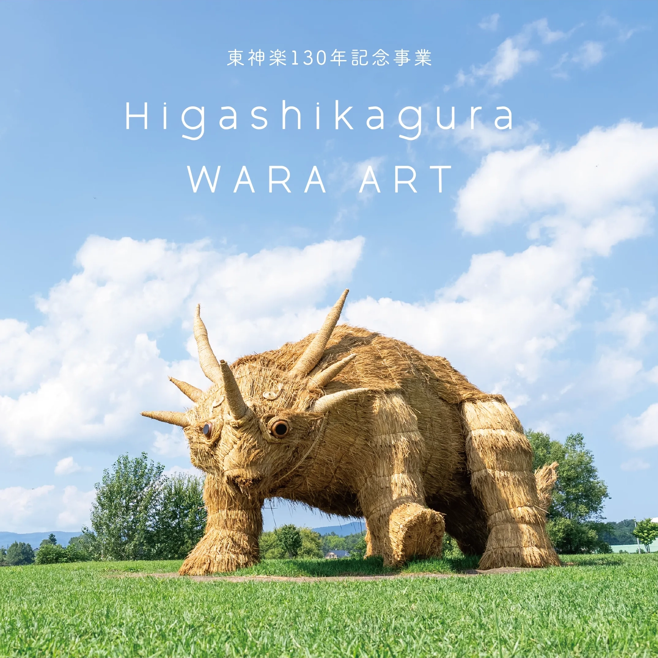 花の町東神楽に現れた熊「かぐらベア」と角竜「スティラコサウルス」。町の開拓が始まって130年の記念事業のひとつとして、町産米の稲わらを編み、骨組みに取付け、地域のボランティアや町役場の職員と共に制作しました。熊は町の中心のバスセンターでおもてなし。角竜は郊外の公園広場に設置しました。