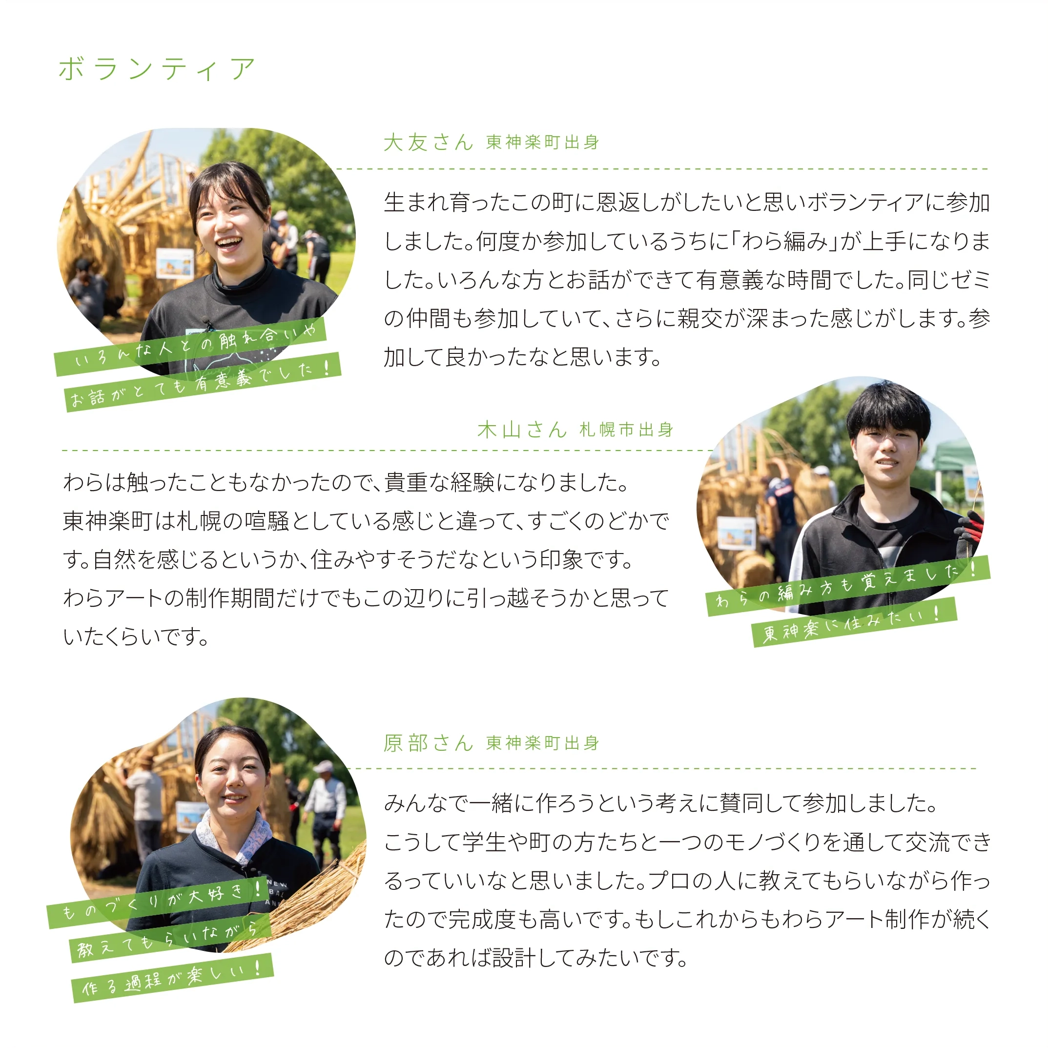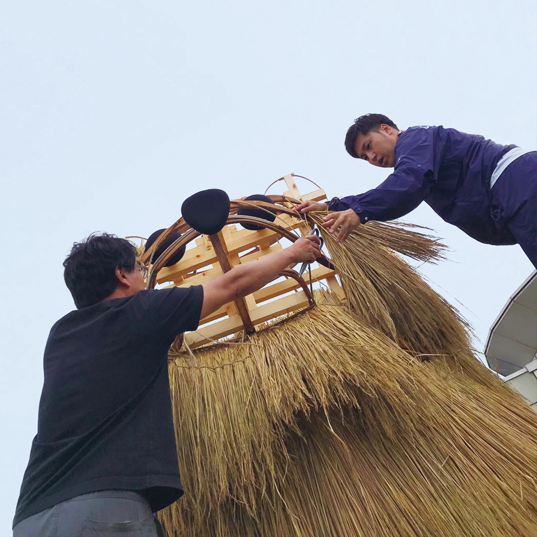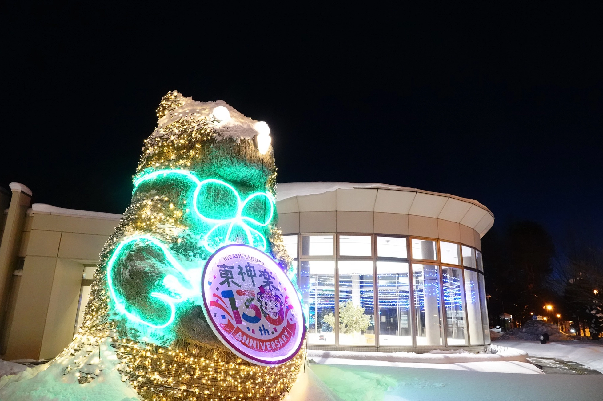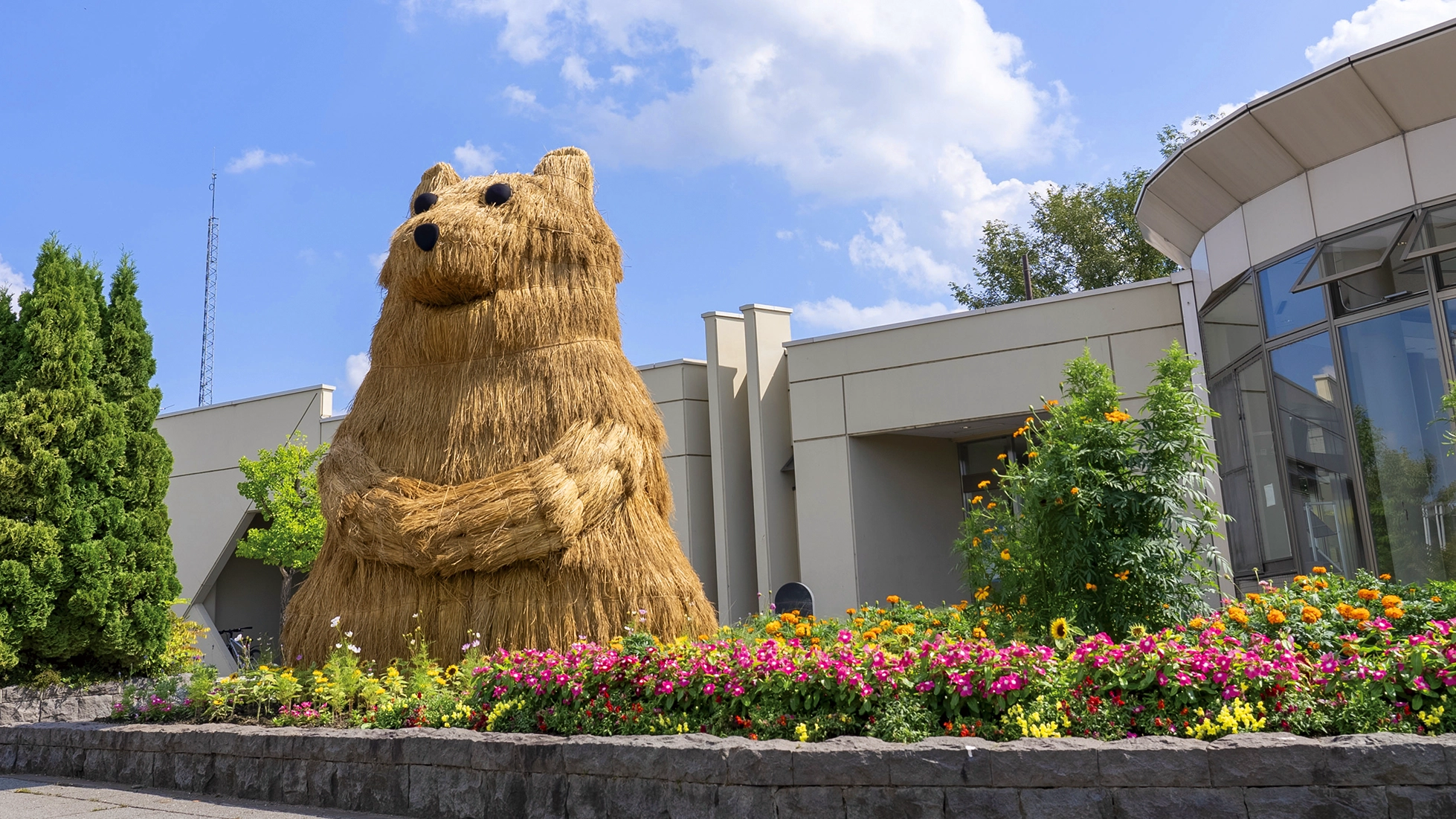 花の町東神楽に現れた熊「かぐらベア」と角竜「スティラコサウルス」。町の開拓が始まって130年の記念事業のひとつとして、町産米の稲わらを編み、骨組みに取付け、地域のボランティアや町役場の職員と共に制作しました。熊は町の中心のバスセンターでおもてなし。角竜は郊外の公園広場に設置しました。